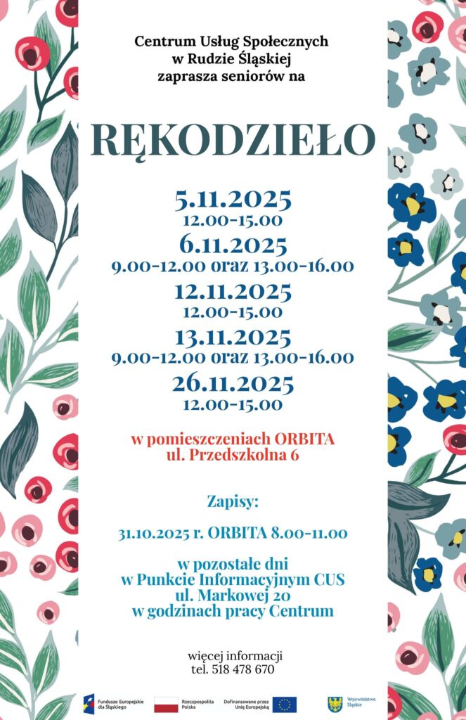 Centrum Usług Społecznych w Rudzie Śląskiej zaprasza wszystkich seniorów na listopadowe zajęcia rękodzieła do pomieszczeń „Orbita” przy ul. Przedszkolnej 6.