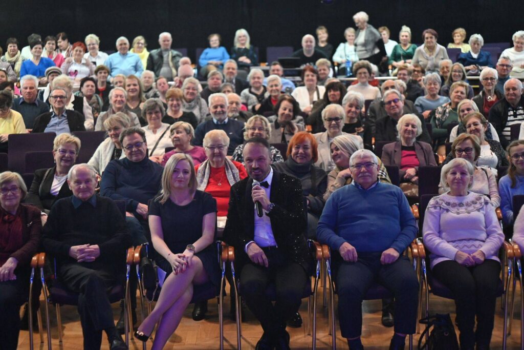 Wyczekiwanym punktem tego wydarzenia był pełen emocji koncert Damiana Holeckiego, który od pierwszych chwil porwał publiczność. Artysta wraz z zespołem szybko stworzył ciepłą, serdeczną atmosferę, zwracając się do seniorów z podziękowaniami za ich obecność oraz ważną rolę, jaką odgrywają w życiu rodzin. Już po kilku minutach było jasne, że ten wieczór stanie się dla wielu uczestników wyjątkowym przeżyciem. Na scenie zabrzmiały najbardziej znane i lubiane utwory Damiana Holeckiego, a wśród nich takie hity jak „Karolino”, „Ja szukam Ciebie”, „Jesteś Aniołem moim” czy wzruszające „Mamo, dla Ciebie jestem”. Każda kolejna piosenka wywoływała entuzjastyczne reakcje — publiczność śpiewała razem z artystą, kołysała się do rytmu i z uśmiechem chłonęła każdą chwilę. Energia płynąca ze sceny udzielała się wszystkim, sprawiając, że atmosfera stawała się coraz bardziej radosna.